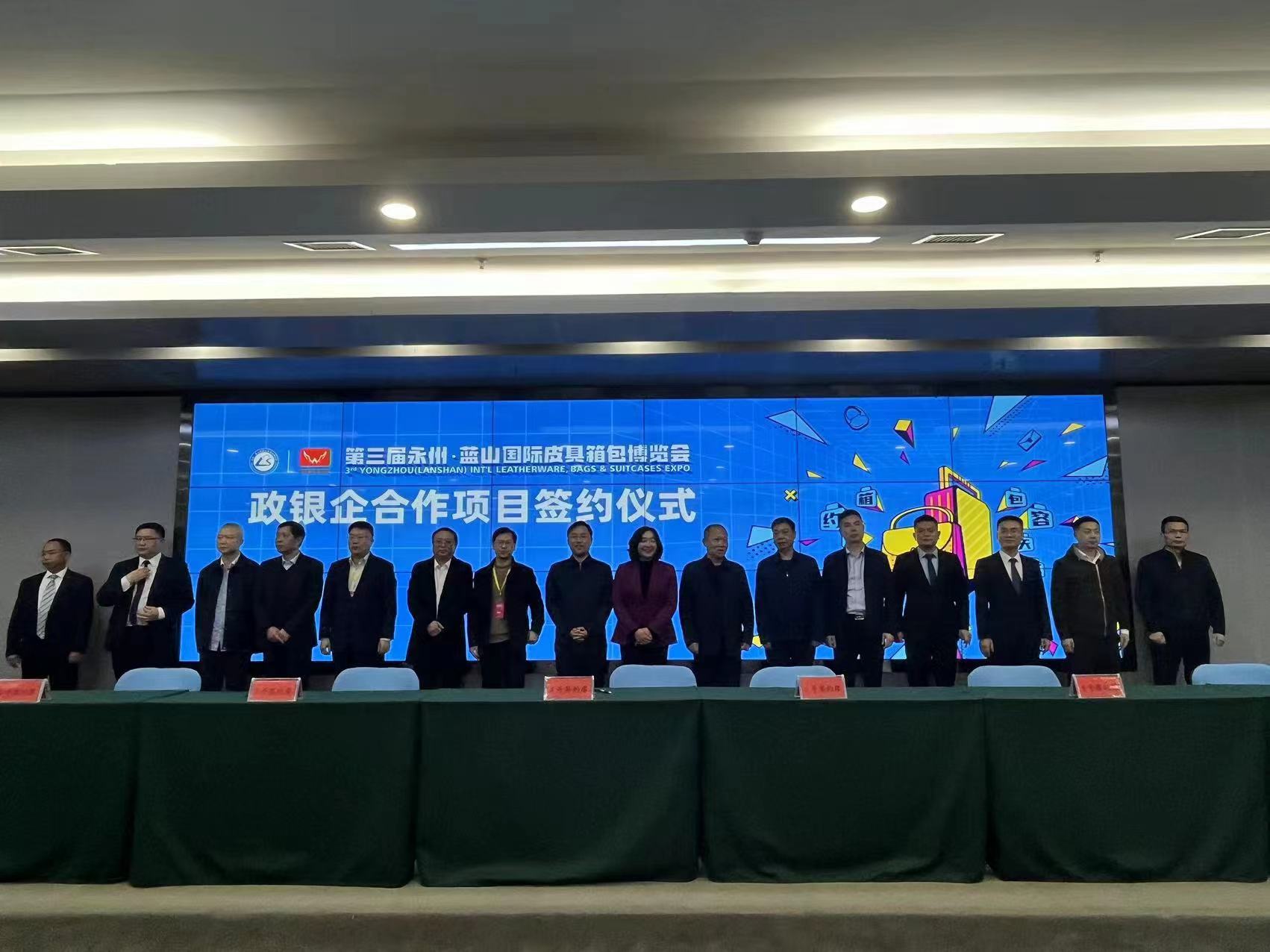 3月24日上午,第三屆永州·藍(lán)山國際皮具箱包博覽會開幕后,藍(lán)山縣舉行政銀企合作項目簽約儀式。永州市政府副秘書長肖瀟、永州市人民銀行中心支行行長王一凡、永州市銀保監(jiān)分局二級調(diào)研員李樹屏、永州市優(yōu)化辦主任文貽榮、永州市各銀行機構(gòu)主要負(fù)責(zé)人以及藍(lán)山縣委副書記、縣長鄧群,縣委常委、常務(wù)副縣長張國材,副縣長劉建軍等領(lǐng)導(dǎo)參加了儀式。