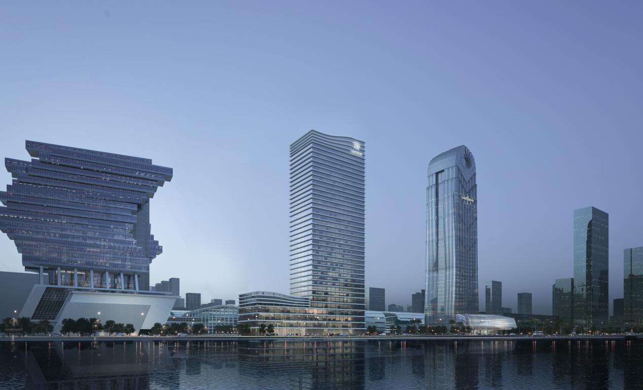 據(jù)悉,廣交會展館四期項目東地塊結(jié)構(gòu)體系為框架-核心筒體系,塔樓共35層,主屋面標高149.32米。主屋面以上還有4層核心筒炮樓和6道花架梁構(gòu)成的塔冠結(jié)構(gòu),花架梁最高部位標高171.82米,最低處166.42米,整體呈飄帶狀,與廣交會展館遙相呼應。